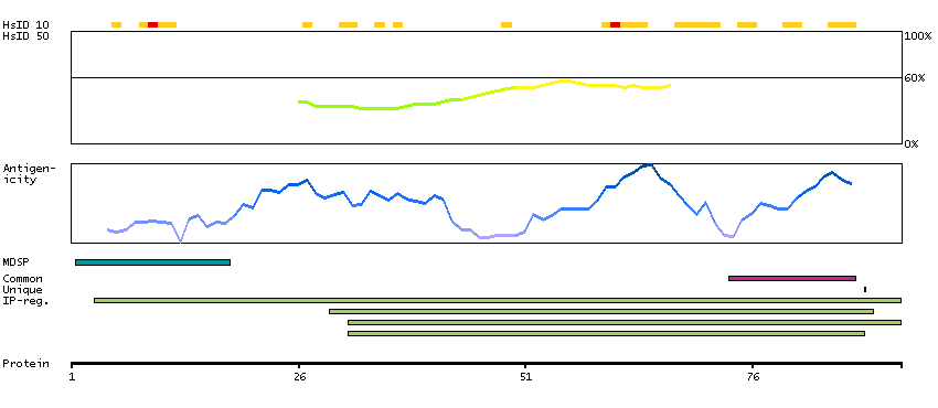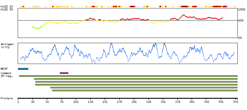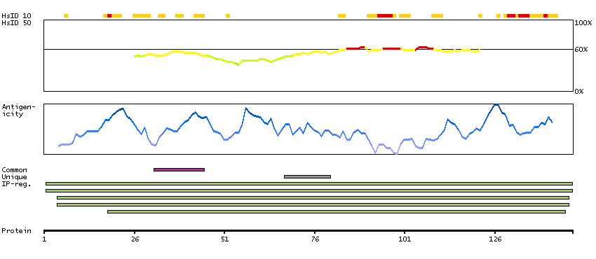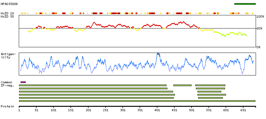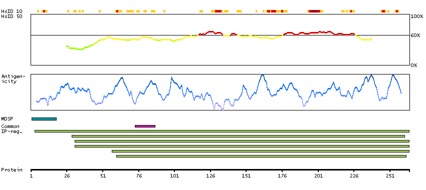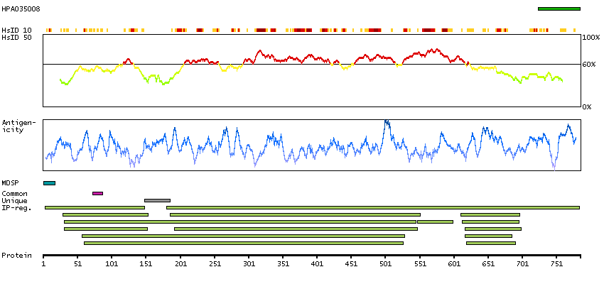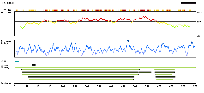 Under the antigens, the maximum percent sequence identity of the protein to all other proteins from other human genes is displayed, using a sliding window of 10 aa residues (HsID 10) or 50 aa residues (HsID 50). The region with the lowest possible identity is always selected for antigen design, with a maximum identity of 60% allowed for designing a single-target antigen (read more).
