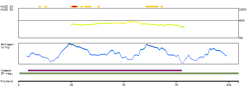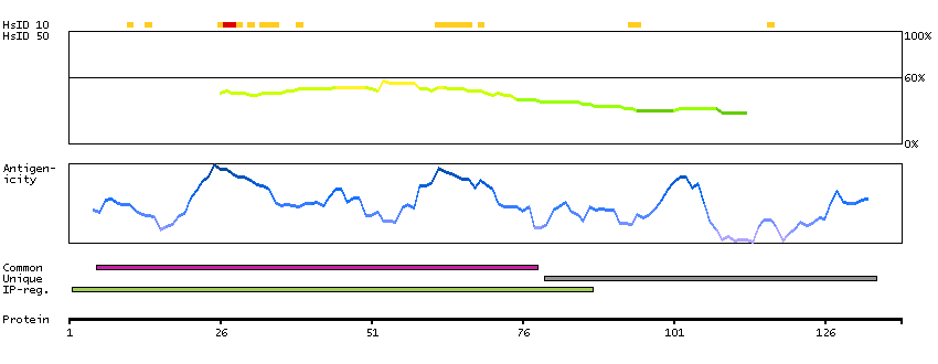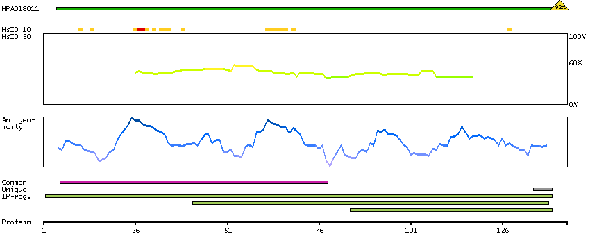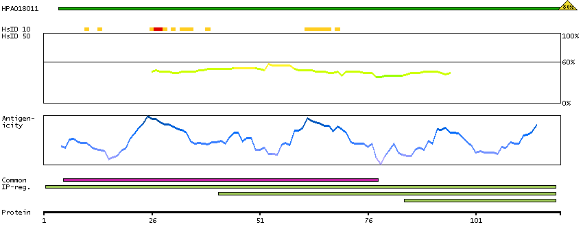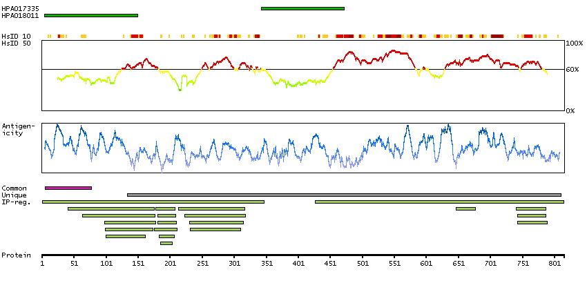 Under the antigens, the maximum percent sequence identity of the protein to all other proteins from other human genes is displayed, using a sliding window of 10 aa residues (HsID 10) or 50 aa residues (HsID 50). The region with the lowest possible identity is always selected for antigen design, with a maximum identity of 60% allowed for designing a single-target antigen (read more).
