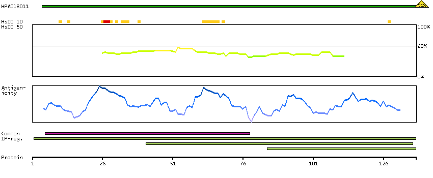 The curve in blue displays the predicted antigenicity i.e. the tendency for different regions of the protein to generate an immune response, with peak regions being predicted to be more antigenic.The curve shows average values based on a sliding window approach using an in-house propensity scale. (read more).