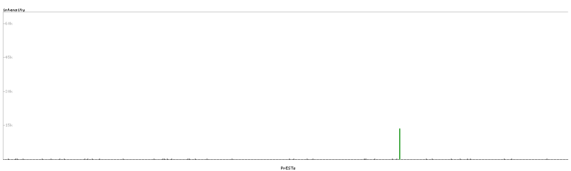 At the top of the view, the position of the antigen (identified by the corresponding HPA identifier) is shown as a green bar. A yellow triangle on the bar indicates a <100% sequence identity to the protein target.