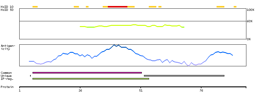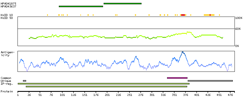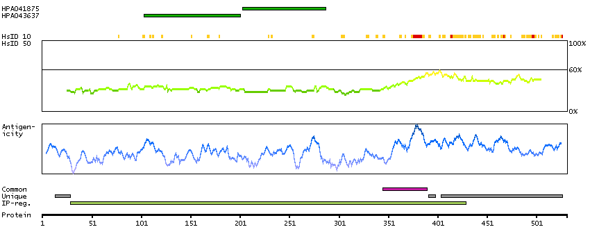 Under the antigens, the maximum percent sequence identity of the protein to all other proteins from other human genes is displayed, using a sliding window of 10 aa residues (HsID 10) or 50 aa residues (HsID 50). The region with the lowest possible identity is always selected for antigen design, with a maximum identity of 60% allowed for designing a single-target antigen (read more).