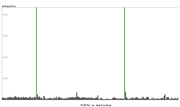 At the top of the view, the position of the antigen (identified by the corresponding HPA identifier) is shown as a green bar. A yellow triangle on the bar indicates a <100% sequence identity to the protein target.