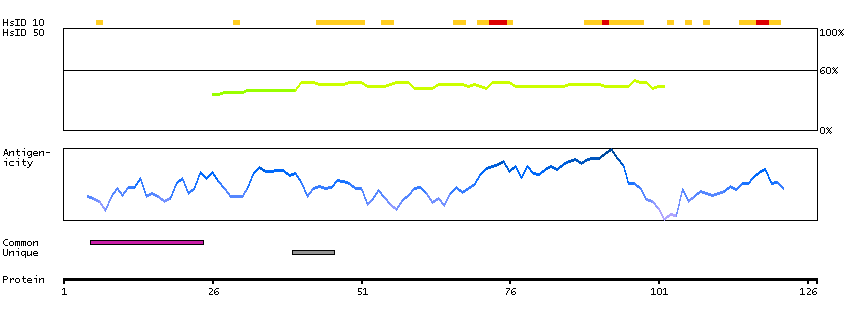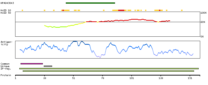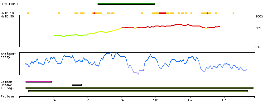 Under the antigens, the maximum percent sequence identity of the protein to all other proteins from other human genes is displayed, using a sliding window of 10 aa residues (HsID 10) or 50 aa residues (HsID 50). The region with the lowest possible identity is always selected for antigen design, with a maximum identity of 60% allowed for designing a single-target antigen (read more).