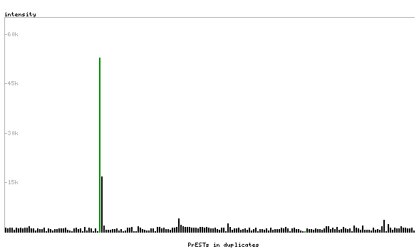 At the top of the view, the position of the antigen (identified by the corresponding HPA identifier) is shown as a green bar. A yellow triangle on the bar indicates a <100% sequence identity to the protein target.