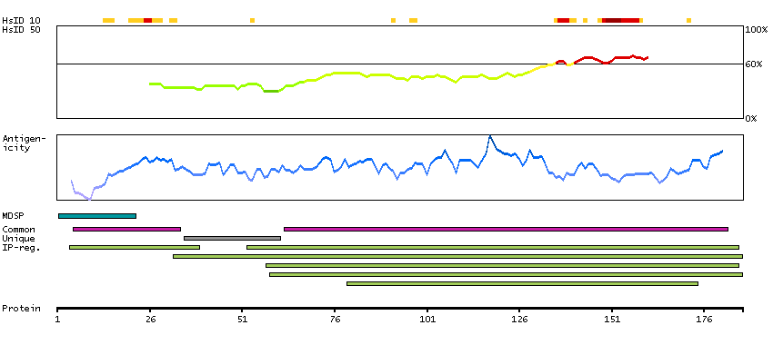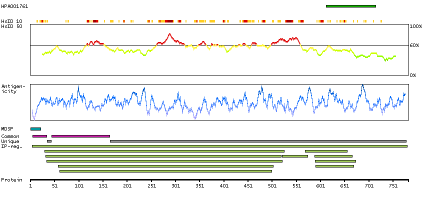 Under the antigens, the maximum percent sequence identity of the protein to all other proteins from other human genes is displayed, using a sliding window of 10 aa residues (HsID 10) or 50 aa residues (HsID 50). The region with the lowest possible identity is always selected for antigen design, with a maximum identity of 60% allowed for designing a single-target antigen (read more).