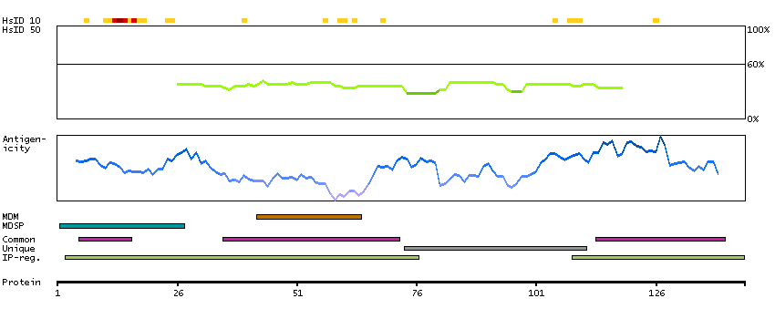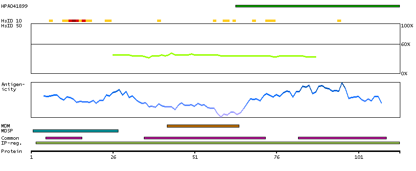 Under the antigens, the maximum percent sequence identity of the protein to all other proteins from other human genes is displayed, using a sliding window of 10 aa residues (HsID 10) or 50 aa residues (HsID 50). The region with the lowest possible identity is always selected for antigen design, with a maximum identity of 60% allowed for designing a single-target antigen (read more).