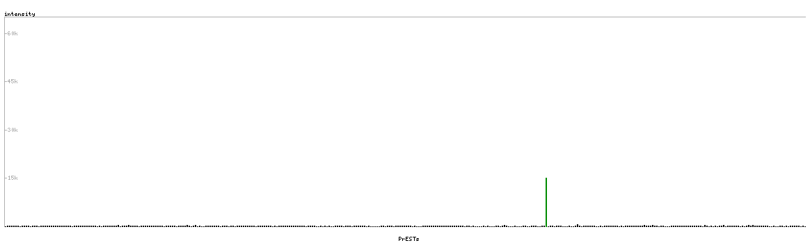 At the top of the view, the position of the antigen (identified by the corresponding HPA identifier) is shown as a green bar. A yellow triangle on the bar indicates a <100% sequence identity to the protein target.