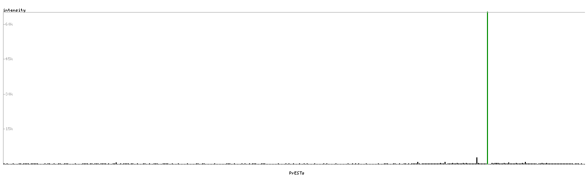 At the top of the view, the position of the antigen (identified by the corresponding HPA identifier) is shown as a green bar. A yellow triangle on the bar indicates a <100% sequence identity to the protein target.