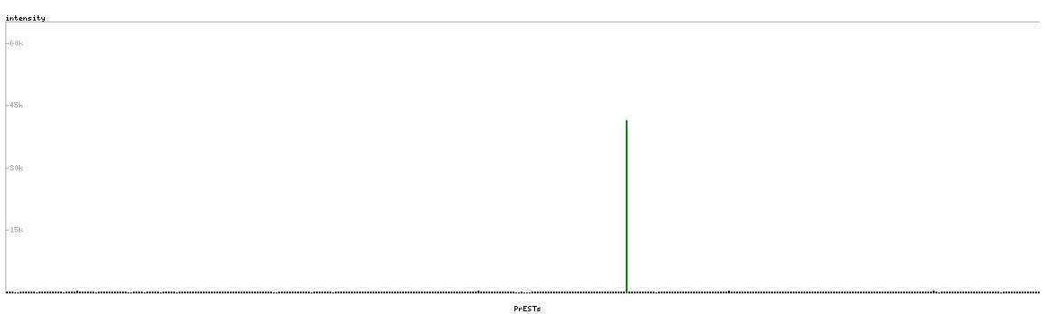 At the top of the view, the position of the antigen (identified by the corresponding HPA identifier) is shown as a green bar. A yellow triangle on the bar indicates a <100% sequence identity to the protein target.