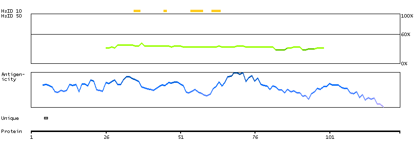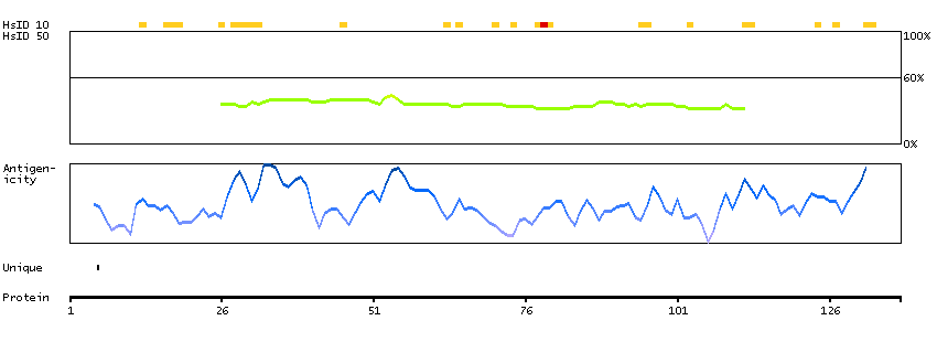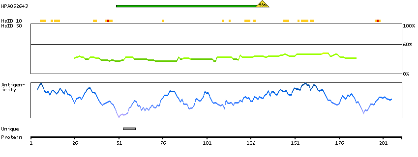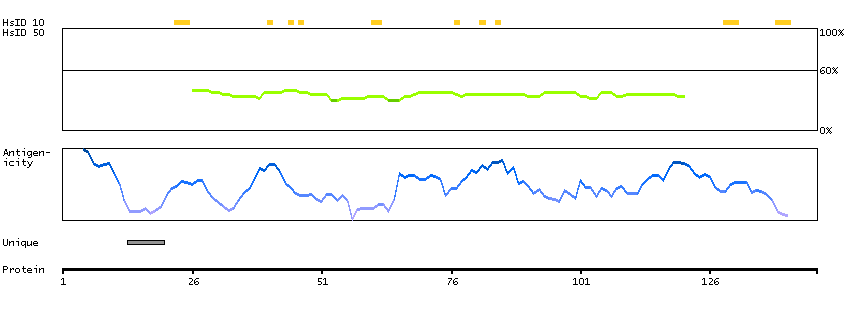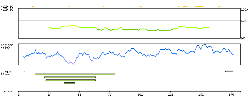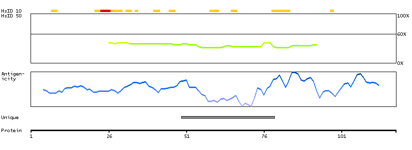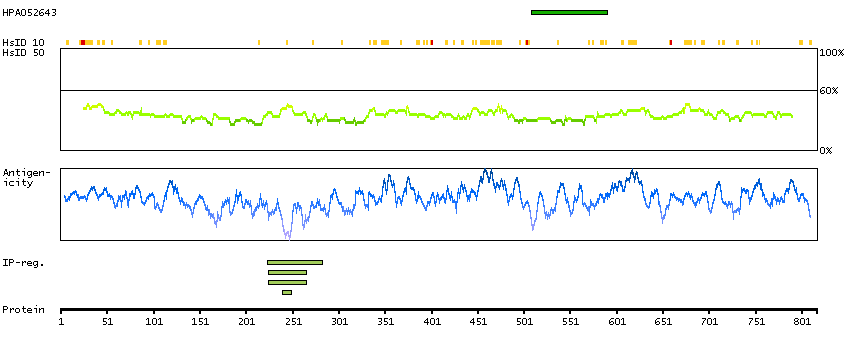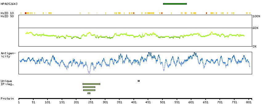 Under the antigens, the maximum percent sequence identity of the protein to all other proteins from other human genes is displayed, using a sliding window of 10 aa residues (HsID 10) or 50 aa residues (HsID 50). The region with the lowest possible identity is always selected for antigen design, with a maximum identity of 60% allowed for designing a single-target antigen (read more).