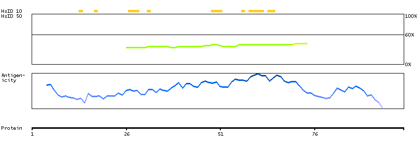 The curve in blue displays the predicted antigenicity i.e. the tendency for different regions of the protein to generate an immune response, with peak regions being predicted to be more antigenic.The curve shows average values based on a sliding window approach using an in-house propensity scale. (read more).