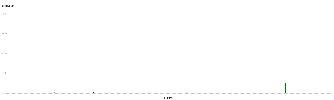 At the top of the view, the position of the antigen (identified by the corresponding HPA identifier) is shown as a green bar. A yellow triangle on the bar indicates a <100% sequence identity to the protein target.