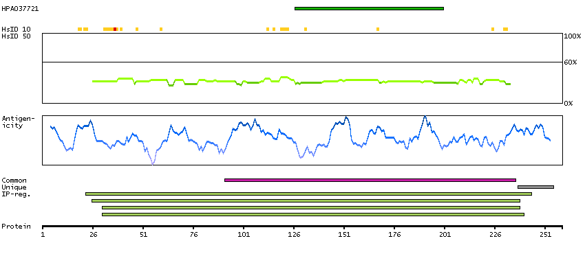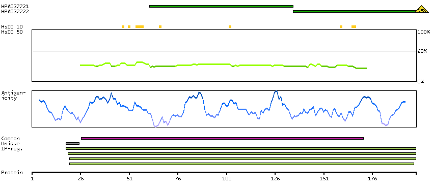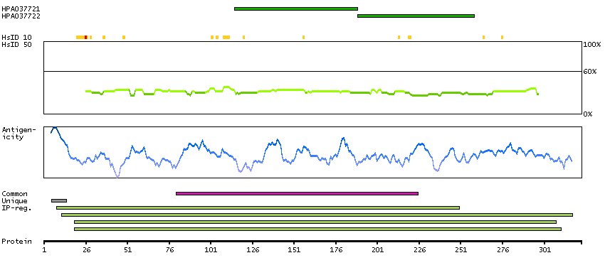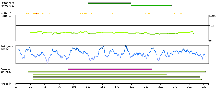 Under the antigens, the maximum percent sequence identity of the protein to all other proteins from other human genes is displayed, using a sliding window of 10 aa residues (HsID 10) or 50 aa residues (HsID 50). The region with the lowest possible identity is always selected for antigen design, with a maximum identity of 60% allowed for designing a single-target antigen (read more).