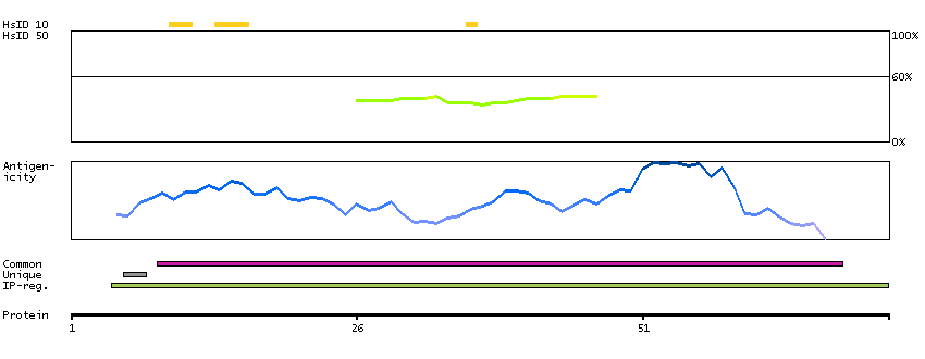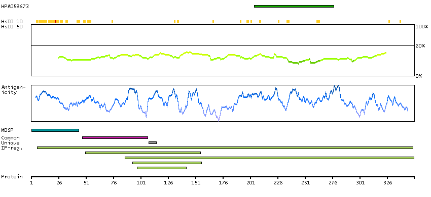 Under the antigens, the maximum percent sequence identity of the protein to all other proteins from other human genes is displayed, using a sliding window of 10 aa residues (HsID 10) or 50 aa residues (HsID 50). The region with the lowest possible identity is always selected for antigen design, with a maximum identity of 60% allowed for designing a single-target antigen (read more).