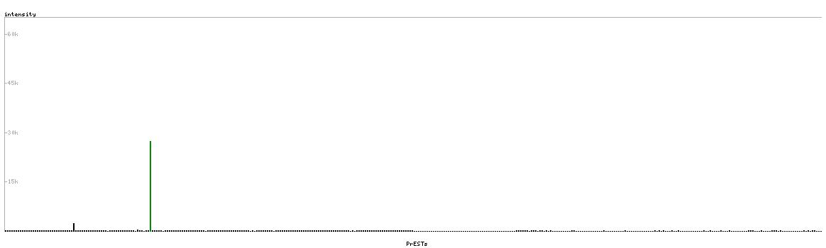 At the top of the view, the position of the antigen (identified by the corresponding HPA identifier) is shown as a green bar. A yellow triangle on the bar indicates a <100% sequence identity to the protein target.