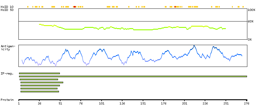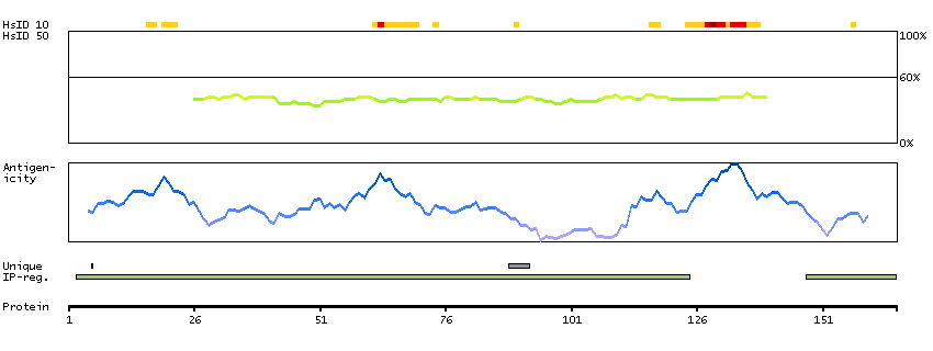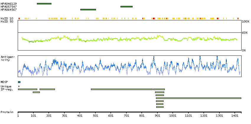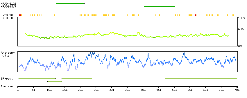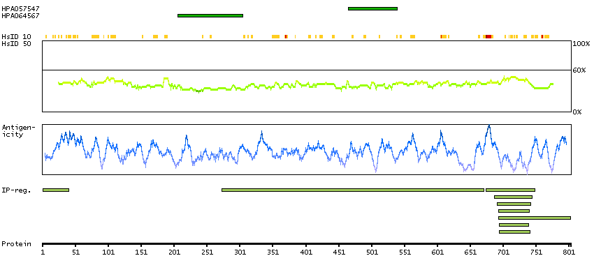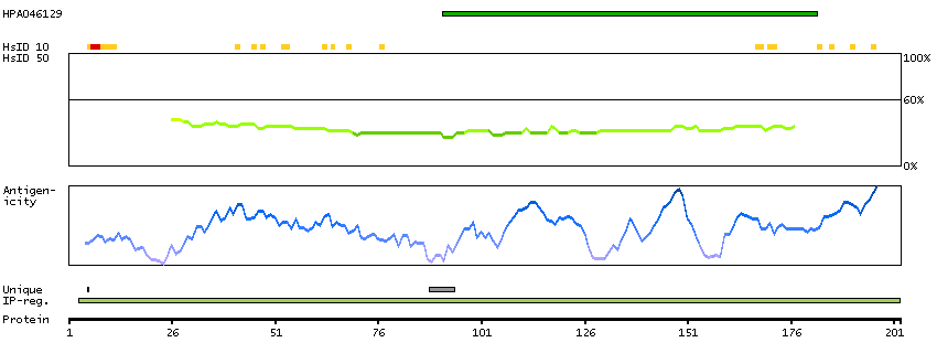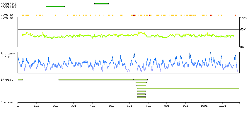Under the antigens, the maximum percent sequence identity of the protein to all other proteins from other human genes is displayed, using a sliding window of 10 aa residues (HsID 10) or 50 aa residues (HsID 50). The region with the lowest possible identity is always selected for antigen design, with a maximum identity of 60% allowed for designing a single-target antigen (read more).
