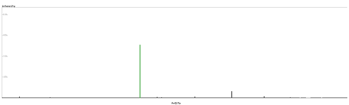 At the top of the view, the position of the antigen (identified by the corresponding HPA identifier) is shown as a green bar. A yellow triangle on the bar indicates a <100% sequence identity to the protein target.