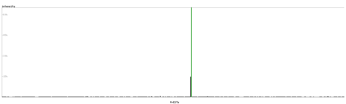 At the top of the view, the position of the antigen (identified by the corresponding HPA identifier) is shown as a green bar. A yellow triangle on the bar indicates a <100% sequence identity to the protein target.