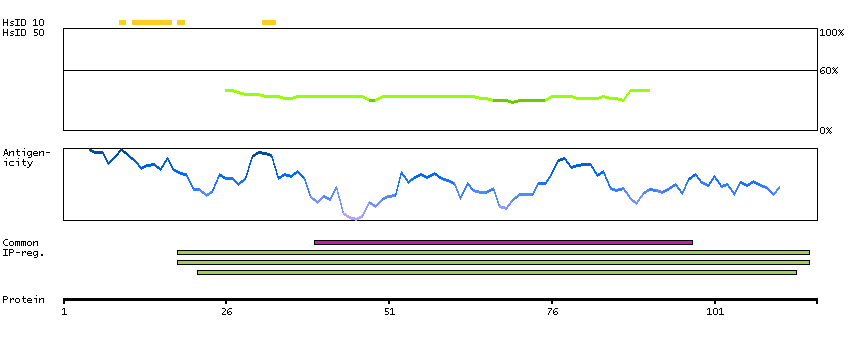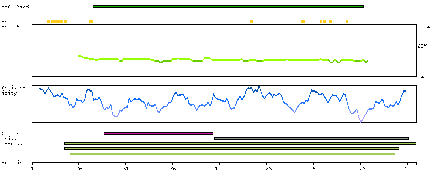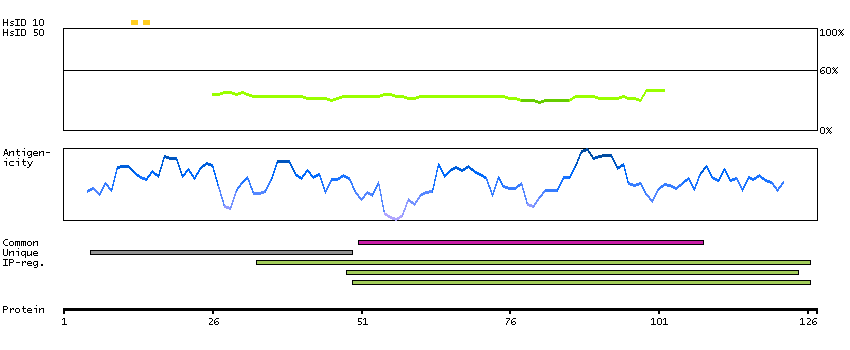 Under the antigens, the maximum percent sequence identity of the protein to all other proteins from other human genes is displayed, using a sliding window of 10 aa residues (HsID 10) or 50 aa residues (HsID 50). The region with the lowest possible identity is always selected for antigen design, with a maximum identity of 60% allowed for designing a single-target antigen (read more).