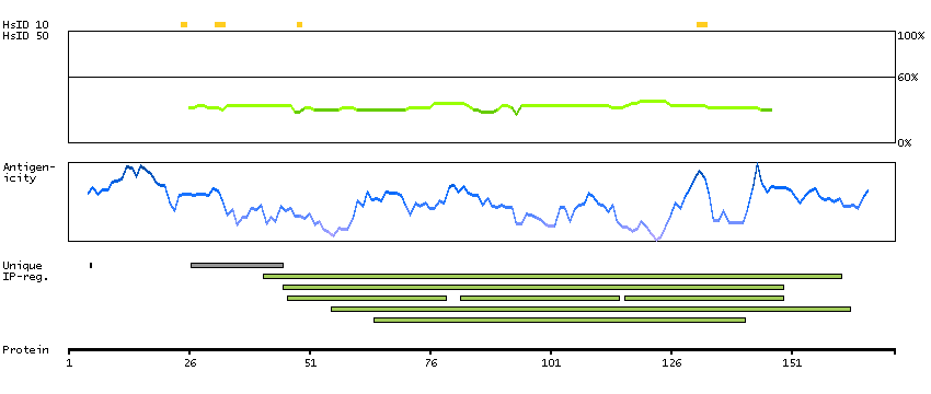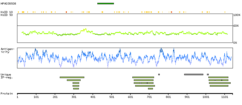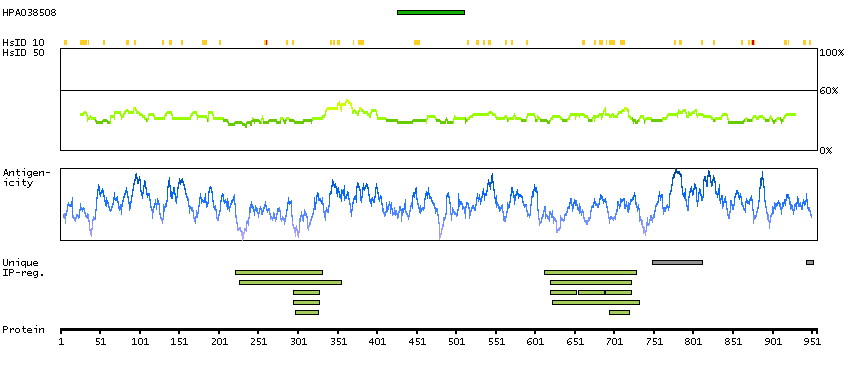 Under the antigens, the maximum percent sequence identity of the protein to all other proteins from other human genes is displayed, using a sliding window of 10 aa residues (HsID 10) or 50 aa residues (HsID 50). The region with the lowest possible identity is always selected for antigen design, with a maximum identity of 60% allowed for designing a single-target antigen (read more).