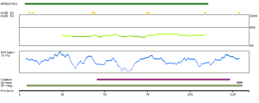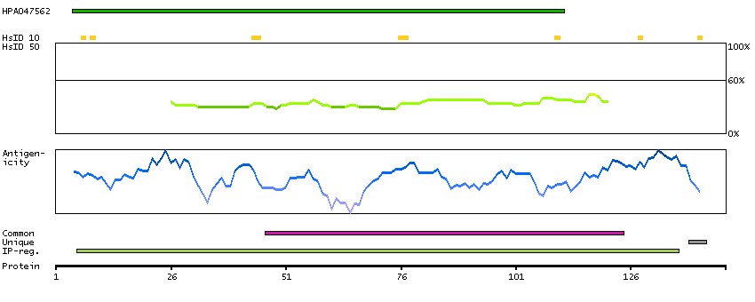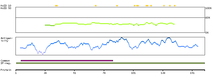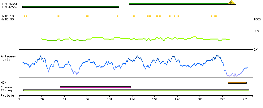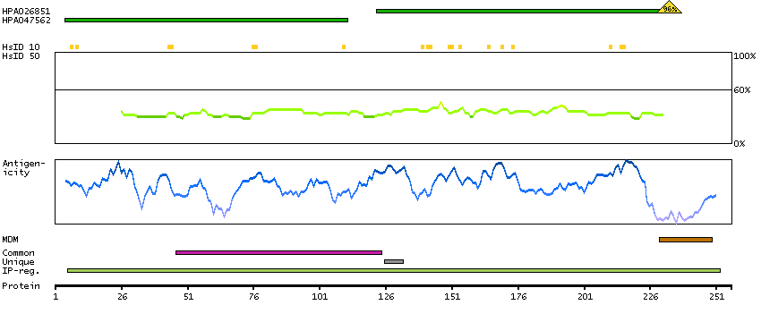Under the antigens, the maximum percent sequence identity of the protein to all other proteins from other human genes is displayed, using a sliding window of 10 aa residues (HsID 10) or 50 aa residues (HsID 50). The region with the lowest possible identity is always selected for antigen design, with a maximum identity of 60% allowed for designing a single-target antigen (read more).