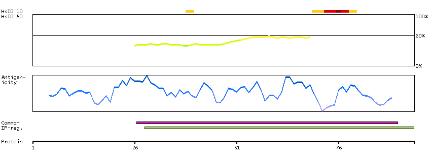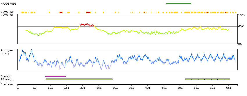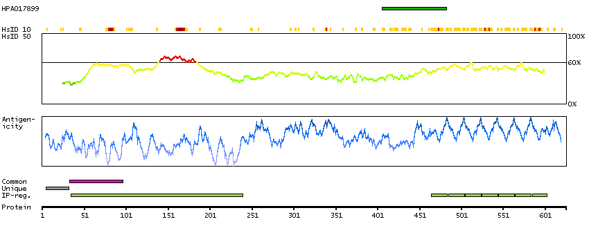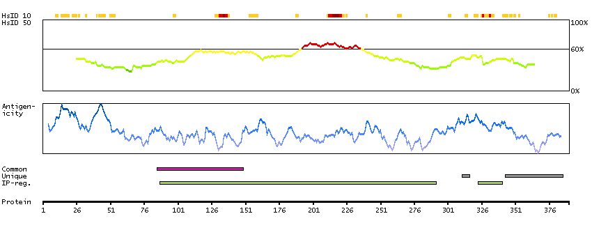 Under the antigens, the maximum percent sequence identity of the protein to all other proteins from other human genes is displayed, using a sliding window of 10 aa residues (HsID 10) or 50 aa residues (HsID 50). The region with the lowest possible identity is always selected for antigen design, with a maximum identity of 60% allowed for designing a single-target antigen (read more).