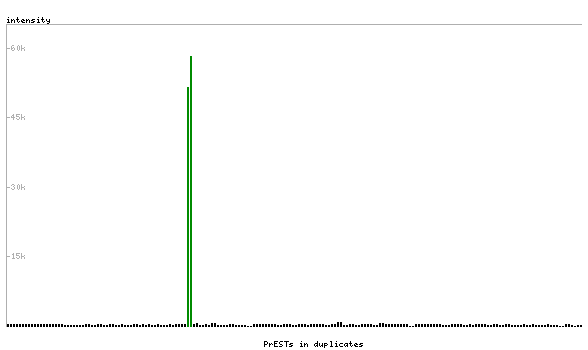 At the top of the view, the position of the antigen (identified by the corresponding HPA identifier) is shown as a green bar. A yellow triangle on the bar indicates a <100% sequence identity to the protein target.