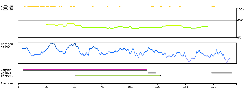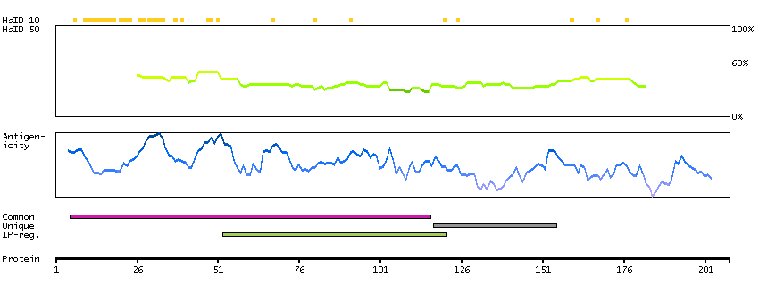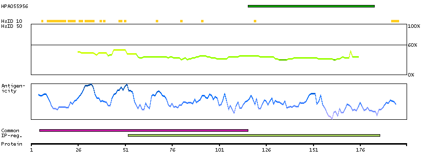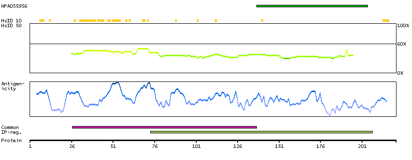Under the antigens, the maximum percent sequence identity of the protein to all other proteins from other human genes is displayed, using a sliding window of 10 aa residues (HsID 10) or 50 aa residues (HsID 50). The region with the lowest possible identity is always selected for antigen design, with a maximum identity of 60% allowed for designing a single-target antigen (read more).