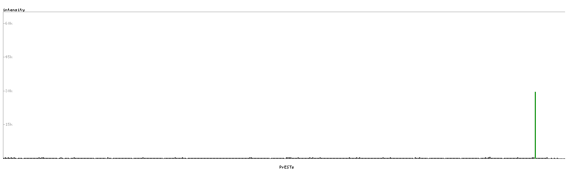 At the top of the view, the position of the antigen (identified by the corresponding HPA identifier) is shown as a green bar. A yellow triangle on the bar indicates a <100% sequence identity to the protein target.