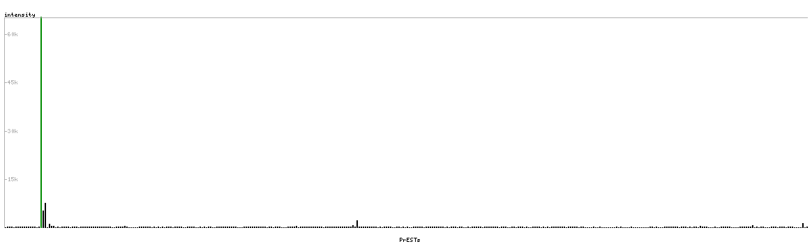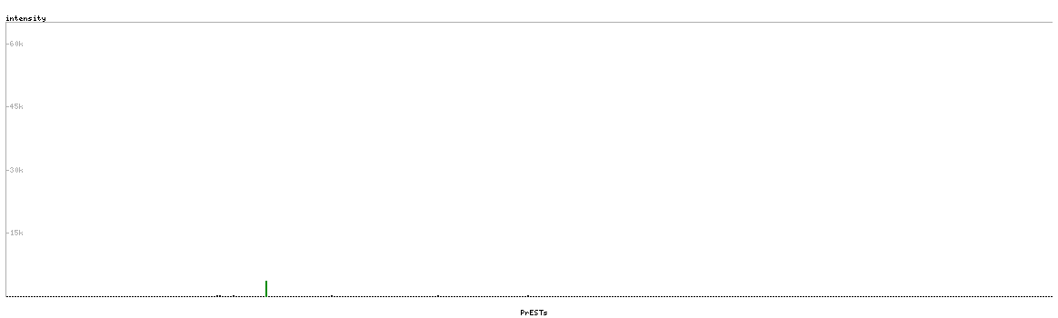 At the top of the view, the position of the antigen (identified by the corresponding HPA identifier) is shown as a green bar. A yellow triangle on the bar indicates a <100% sequence identity to the protein target.