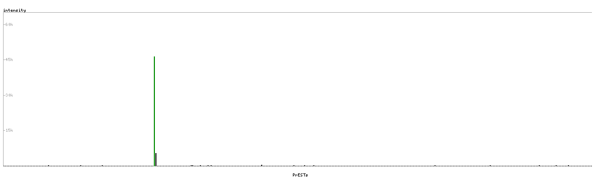 At the top of the view, the position of the antigen (identified by the corresponding HPA identifier) is shown as a green bar. A yellow triangle on the bar indicates a <100% sequence identity to the protein target.