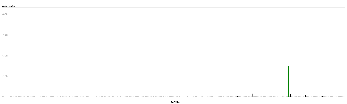 At the top of the view, the position of the antigen (identified by the corresponding HPA identifier) is shown as a green bar. A yellow triangle on the bar indicates a <100% sequence identity to the protein target.