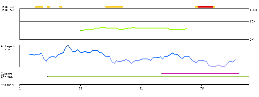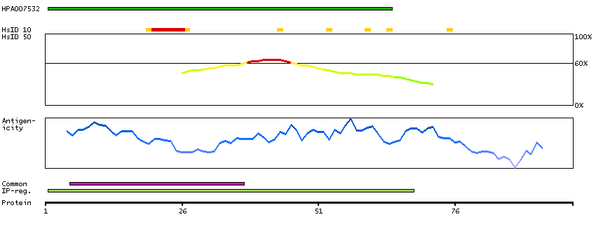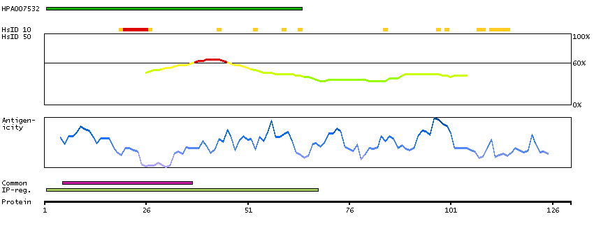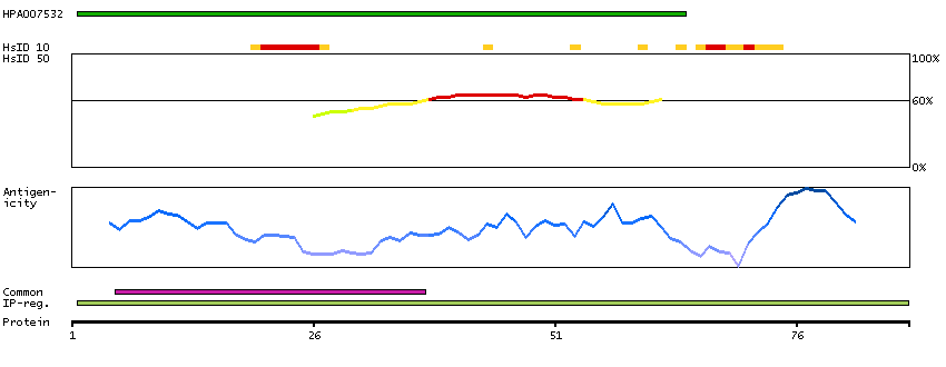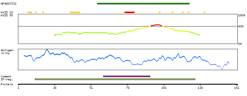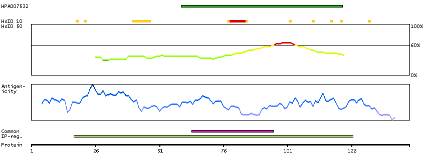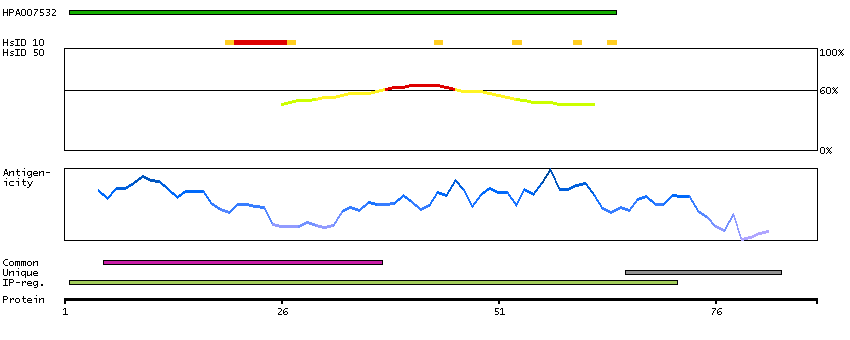 Under the antigens, the maximum percent sequence identity of the protein to all other proteins from other human genes is displayed, using a sliding window of 10 aa residues (HsID 10) or 50 aa residues (HsID 50). The region with the lowest possible identity is always selected for antigen design, with a maximum identity of 60% allowed for designing a single-target antigen (read more).