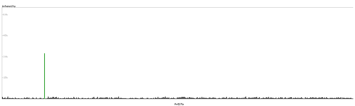 At the top of the view, the position of the antigen (identified by the corresponding HPA identifier) is shown as a green bar. A yellow triangle on the bar indicates a <100% sequence identity to the protein target.