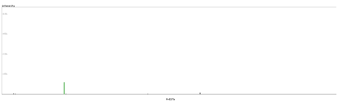 At the top of the view, the position of the antigen (identified by the corresponding HPA identifier) is shown as a green bar. A yellow triangle on the bar indicates a <100% sequence identity to the protein target.