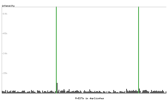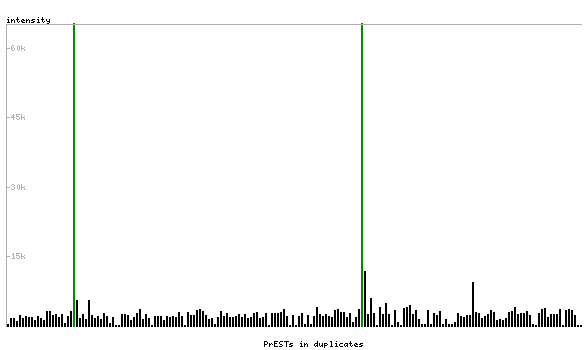 At the top of the view, the position of the antigen (identified by the corresponding HPA identifier) is shown as a green bar. A yellow triangle on the bar indicates a <100% sequence identity to the protein target.