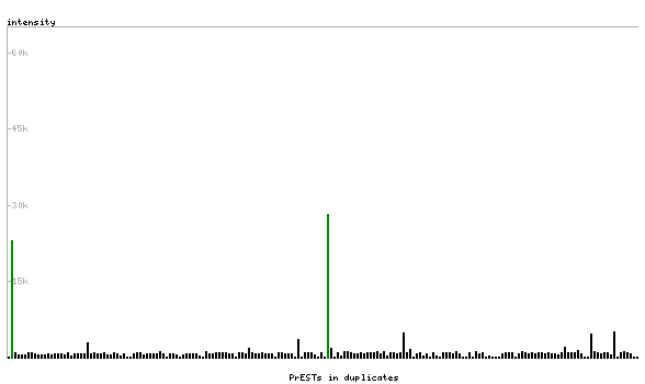 Under the antigens, the maximum percent sequence identity of the protein to all other proteins from other human genes is displayed, using a sliding window of 10 aa residues (HsID 10) or 50 aa residues (HsID 50). The region with the lowest possible identity is always selected for antigen design, with a maximum identity of 60% allowed for designing a single-target antigen (read more).