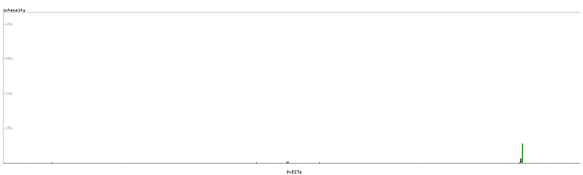 At the top of the view, the position of the antigen (identified by the corresponding HPA identifier) is shown as a green bar. A yellow triangle on the bar indicates a <100% sequence identity to the protein target.