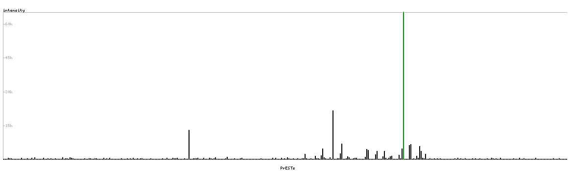 At the top of the view, the position of the antigen (identified by the corresponding HPA identifier) is shown as a green bar. A yellow triangle on the bar indicates a <100% sequence identity to the protein target.
