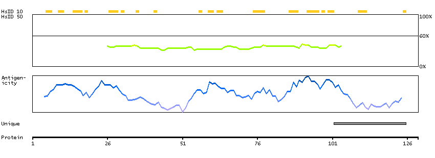 Under the antigens, the maximum percent sequence identity of the protein to all other proteins from other human genes is displayed, using a sliding window of 10 aa residues (HsID 10) or 50 aa residues (HsID 50). The region with the lowest possible identity is always selected for antigen design, with a maximum identity of 60% allowed for designing a single-target antigen (read more).