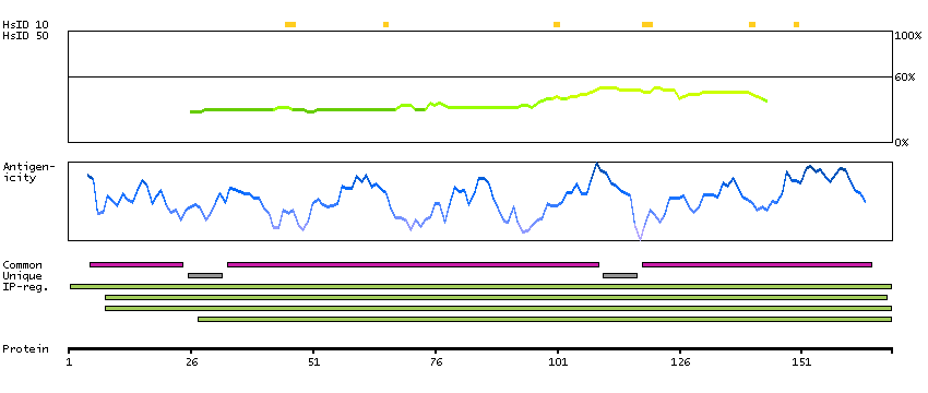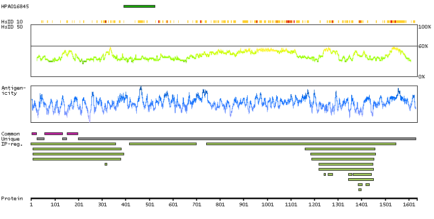 Under the antigens, the maximum percent sequence identity of the protein to all other proteins from other human genes is displayed, using a sliding window of 10 aa residues (HsID 10) or 50 aa residues (HsID 50). The region with the lowest possible identity is always selected for antigen design, with a maximum identity of 60% allowed for designing a single-target antigen (read more).