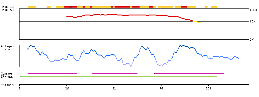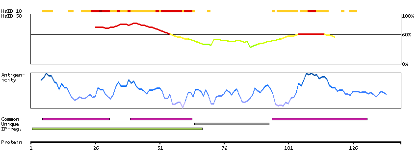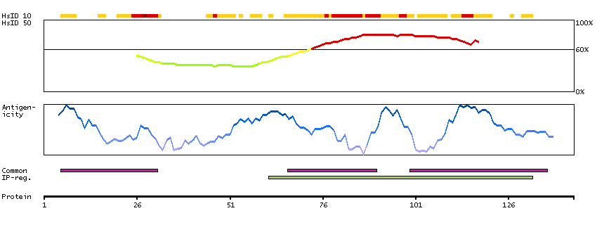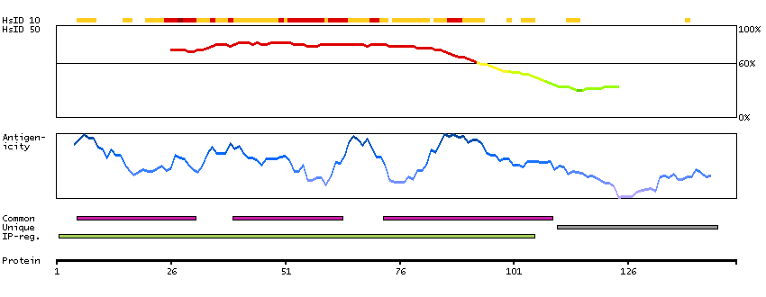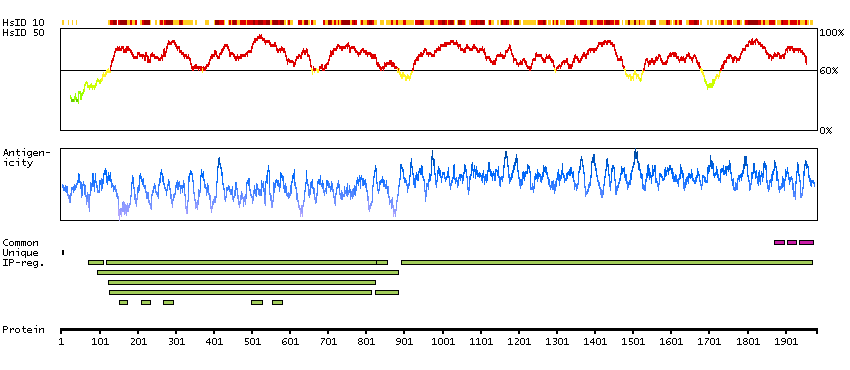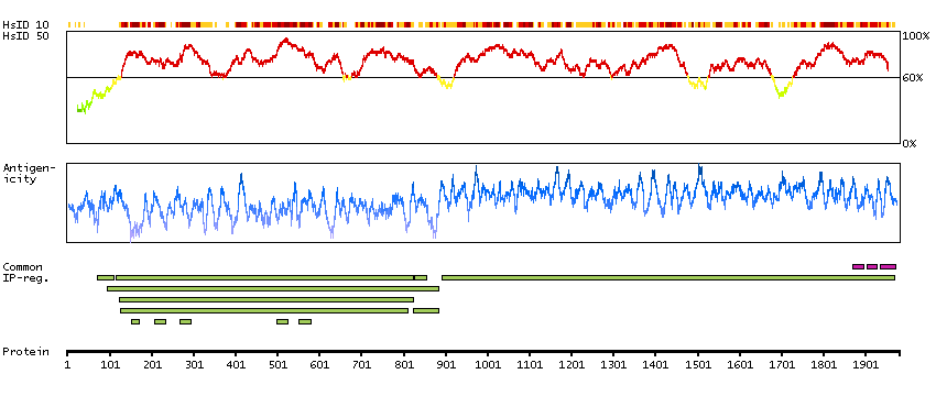 Under the antigens, the maximum percent sequence identity of the protein to all other proteins from other human genes is displayed, using a sliding window of 10 aa residues (HsID 10) or 50 aa residues (HsID 50). The region with the lowest possible identity is always selected for antigen design, with a maximum identity of 60% allowed for designing a single-target antigen (read more).