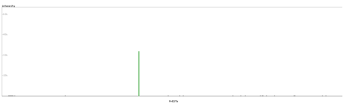 At the top of the view, the position of the antigen (identified by the corresponding HPA identifier) is shown as a green bar. A yellow triangle on the bar indicates a <100% sequence identity to the protein target.