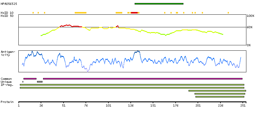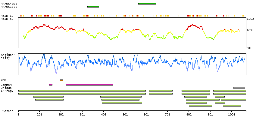 Under the antigens, the maximum percent sequence identity of the protein to all other proteins from other human genes is displayed, using a sliding window of 10 aa residues (HsID 10) or 50 aa residues (HsID 50). The region with the lowest possible identity is always selected for antigen design, with a maximum identity of 60% allowed for designing a single-target antigen (read more).
