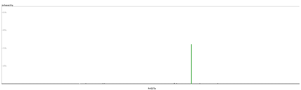 At the top of the view, the position of the antigen (identified by the corresponding HPA identifier) is shown as a green bar. A yellow triangle on the bar indicates a <100% sequence identity to the protein target.