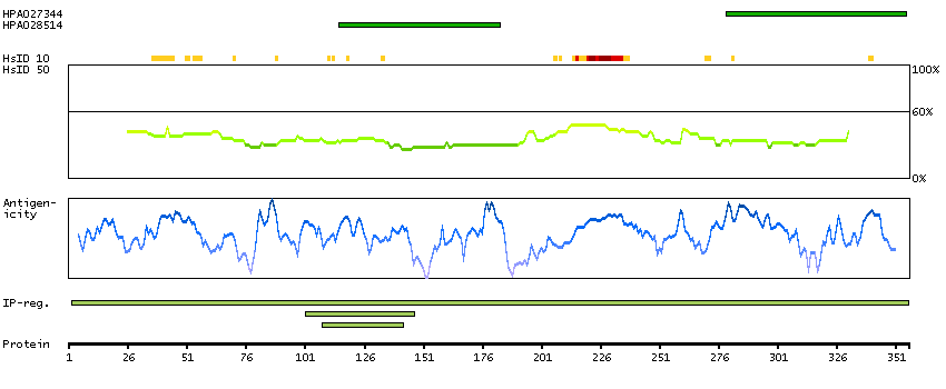 Under the antigens, the maximum percent sequence identity of the protein to all other proteins from other human genes is displayed, using a sliding window of 10 aa residues (HsID 10) or 50 aa residues (HsID 50). The region with the lowest possible identity is always selected for antigen design, with a maximum identity of 60% allowed for designing a single-target antigen (read more).