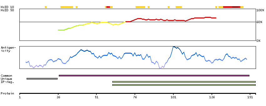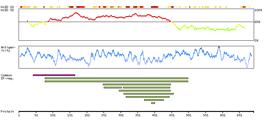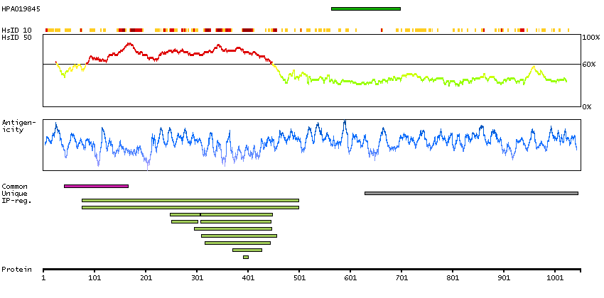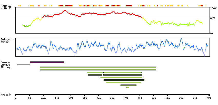 Under the antigens, the maximum percent sequence identity of the protein to all other proteins from other human genes is displayed, using a sliding window of 10 aa residues (HsID 10) or 50 aa residues (HsID 50). The region with the lowest possible identity is always selected for antigen design, with a maximum identity of 60% allowed for designing a single-target antigen (read more).