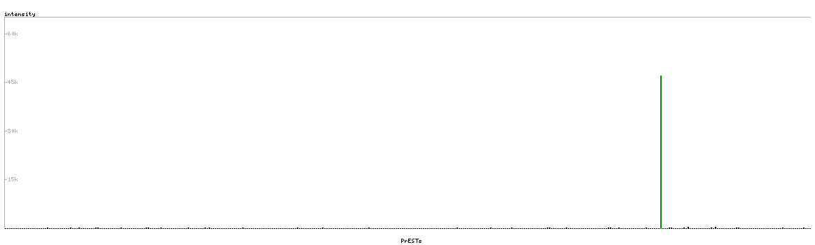 At the top of the view, the position of the antigen (identified by the corresponding HPA identifier) is shown as a green bar. A yellow triangle on the bar indicates a <100% sequence identity to the protein target.
