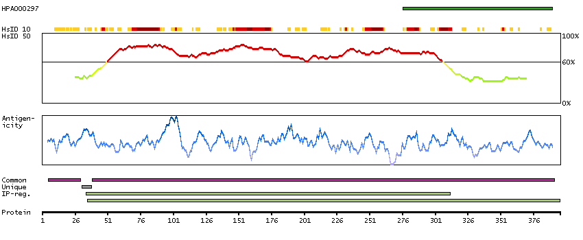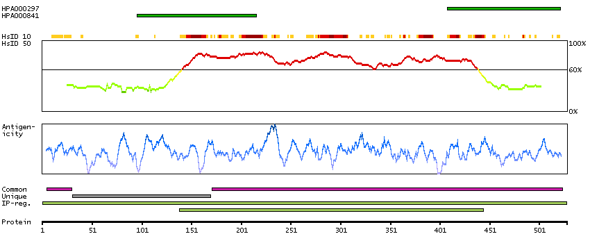 Under the antigens, the maximum percent sequence identity of the protein to all other proteins from other human genes is displayed, using a sliding window of 10 aa residues (HsID 10) or 50 aa residues (HsID 50). The region with the lowest possible identity is always selected for antigen design, with a maximum identity of 60% allowed for designing a single-target antigen (read more).