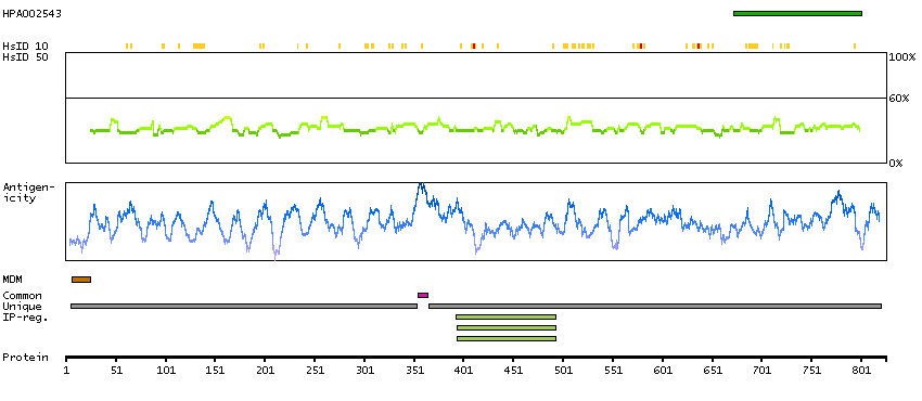 Under the antigens, the maximum percent sequence identity of the protein to all other proteins from other human genes is displayed, using a sliding window of 10 aa residues (HsID 10) or 50 aa residues (HsID 50). The region with the lowest possible identity is always selected for antigen design, with a maximum identity of 60% allowed for designing a single-target antigen (read more).